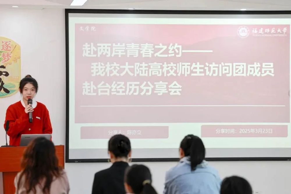 “青听海峡”(第三期)分享会邀请了2024年11月随马龙等一行赴台访问的大陆学子代表、福建师范大学文学院学生陈亦立进行分享交流。陈亦立同学从文化之亲、人情之亲、青年之亲三个方面分享赴台访问的经历和体会,讲述她与台湾青年的互动交流和感受到的两岸青年的血脉联系。