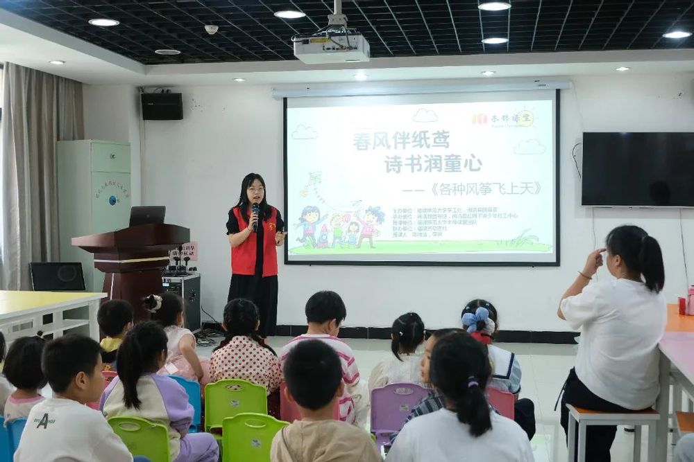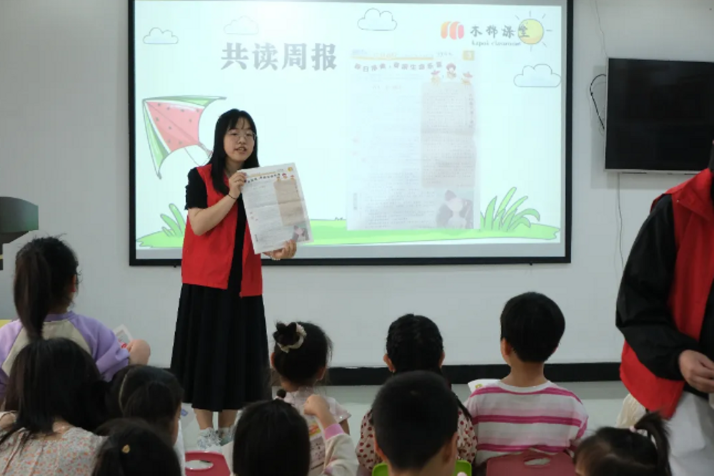故事结束后,孩子们争相发言,有人认为挣脱束缚才是自由,有人觉得有牵绊的飞翔才更安全,稚嫩的话语里藏着对自由深刻的思考,教室里回荡着思维碰撞的热烈气息。随后,陈诗洁同学采用“朗读+游戏”的创新形式,为孩子们讲解诗词与风筝制作工艺,让孩子们在欢乐轻松的“诗词消消乐”游戏中更深入地学习风筝的知识,分享喜悦。同时她还结合《学生周报》相关内容进行讲解,让孩子们对风筝有更深入的了解。