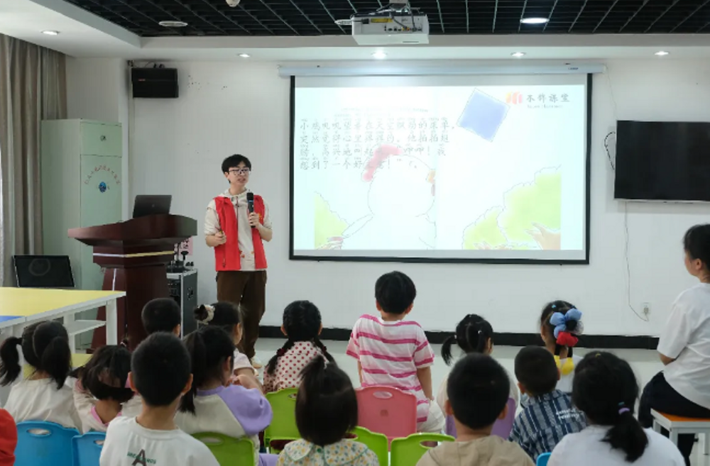 活动伊始,陈诗洁同学从“风筝”作为话题切入点,引导孩子们思考对于风筝的印象,并用知识快问快答的方式调动孩子们的思维。紧接着,李湫同学为小朋友们带来绘本故事《各种风筝飞上天》,用富含想象力的故事激发出孩子们的奇思妙想,将想象与风筝相结合。当小风筝在天空中随风翱翔,却因线的牵引无法肆意驰骋,面对“自由”的困惑时,孩子们的目光紧紧追随着画面,时而皱眉思索,时而小声讨论,在跌宕起伏的情节里,一同探寻着自由的真谛。
