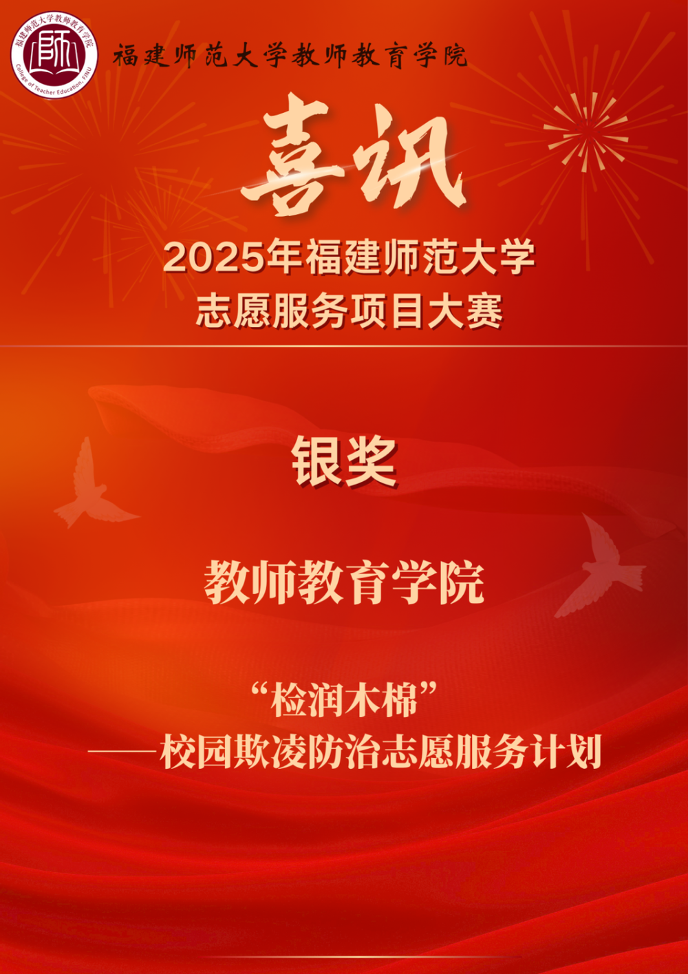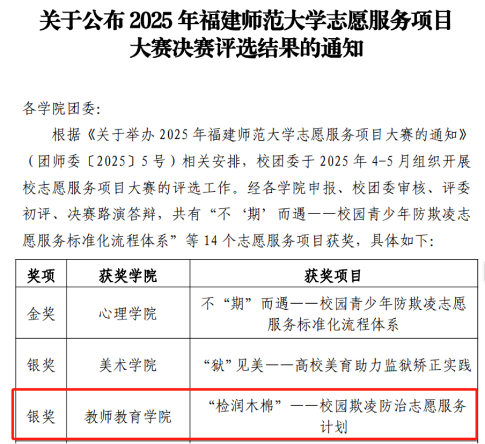 在2025年福建师范大学志愿服务项目大赛中,经校团委审核、评委初评、决赛路演答辩,我院“检润木棉 ——校园欺凌防治志愿服务计划” 项目脱颖而出,荣获大赛银奖!
