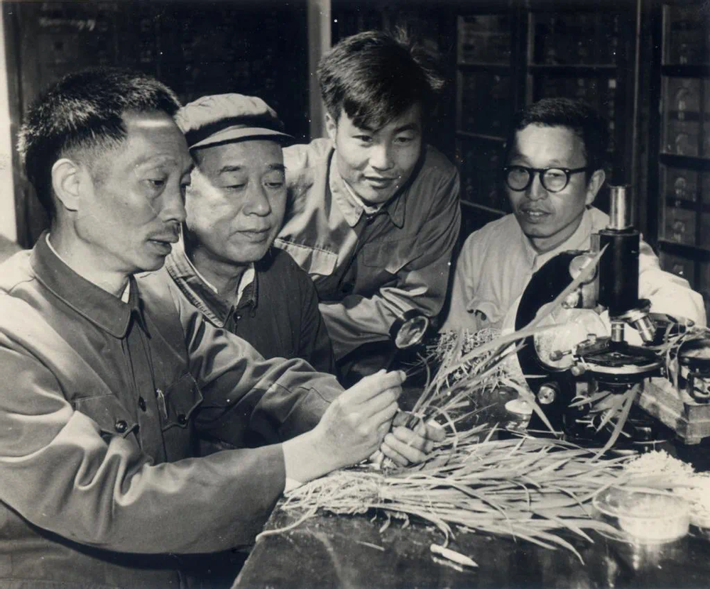 (袁隆平(左一)与科研团队成员早年的工作照 | 湖南杂交水稻研究中心供图)