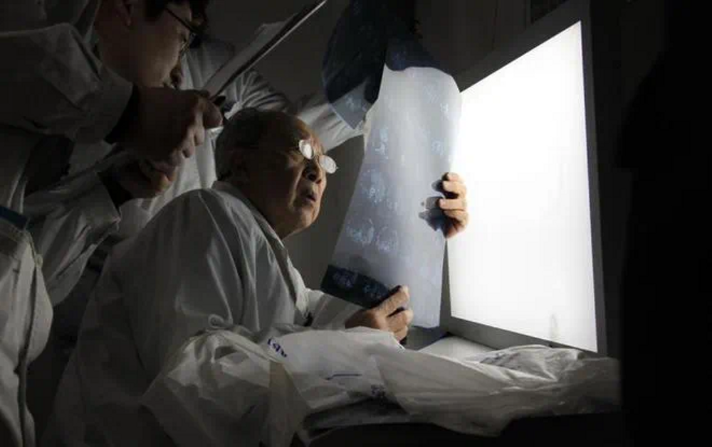 (吴孟超带着学生仔细诊断患者病情,确定手术方案。新华社记者 王建民 摄)