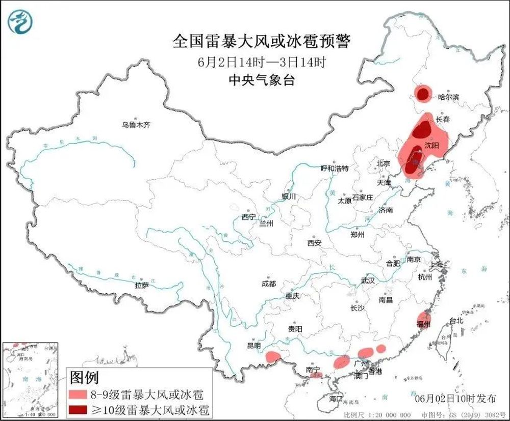 其中提到,预计6月2日14时至3日14时,福建东部和南部沿海、广东中南部、广西南部、云南西北部和东部、西藏东南部以及黑龙江西部、内蒙古东北部等地部分地区有大到暴雨。上述部分地区伴有短时强降水(最大小时降雨量20~40毫米,局地可超过50毫米),局地有雷暴大风或冰雹等强对流天气。