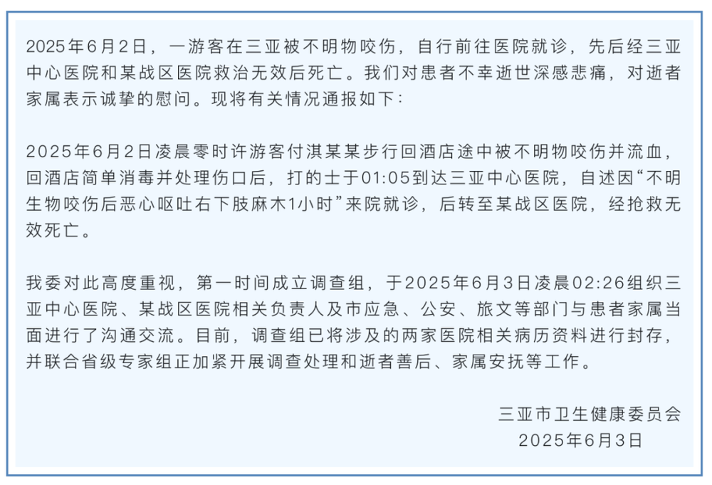 一名游客在海南三亚 被不明物咬伤后身亡