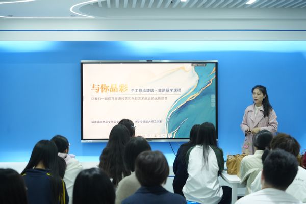 讲座中,沈晓夏老师以“手工彩绘玻璃的历史与当代融合”为切入点,系统梳理了彩玻艺术从清代宫廷画源流至当代非遗创新的发展脉络。她结合《千里江山图》《玉兰锦雀》等作品,阐释彩玻在材料、技法与审美上的独特价值,并分享其在国礼定制、建筑装饰、文创开发等多领域的广泛应用。沈老师强调,彩玻艺术不仅是技艺的传承,更是文化自信与创新精神的体现,鼓励同学们在传统与现代的碰撞中寻找创作灵感。