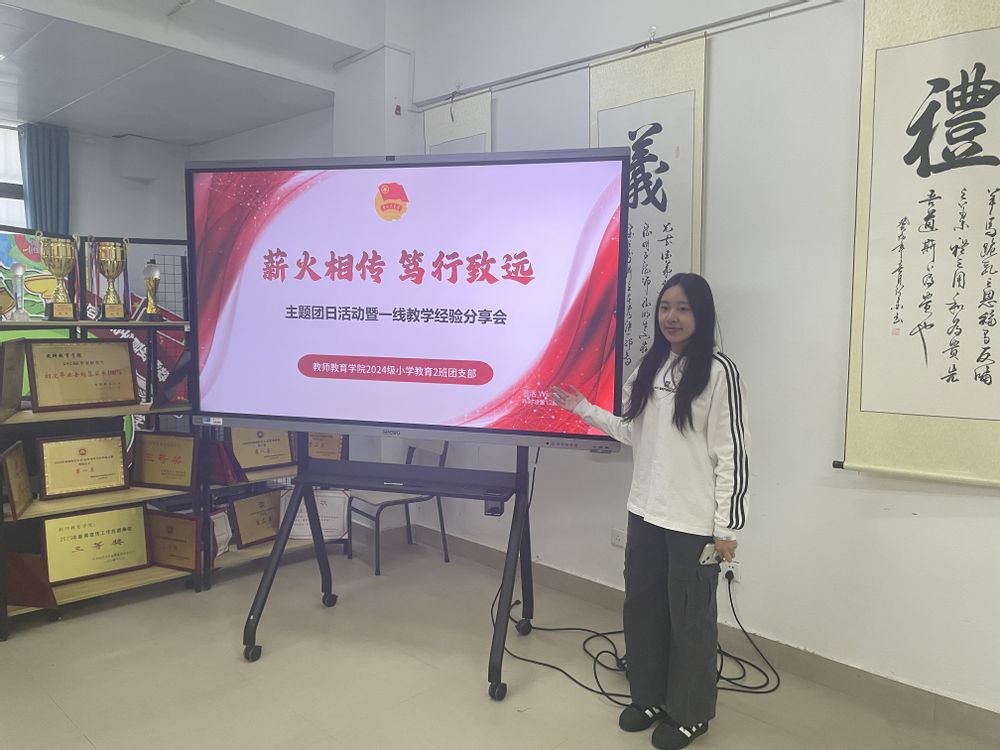 为引导支部成员聆听一线声音、感知真实教育生态,激励师范生夯实专业基础、笃行教育报国,12月7日下午,我院2024级小学教育二班团支部于仓山校区C楼活动室举办“薪火相传,笃行致远”主题团日暨一线教学经验分享活动。活动邀请优秀校友、现就职于福州金山小学的语文教师周伟豪老师返校分享育人经验与成长心得,通过主题分享、互动交流等形式,搭建在校生与一线教师之间的对话平台,强化思想引领,促进专业成长。2024级本科生辅导员廖伊诺参与本次活动。