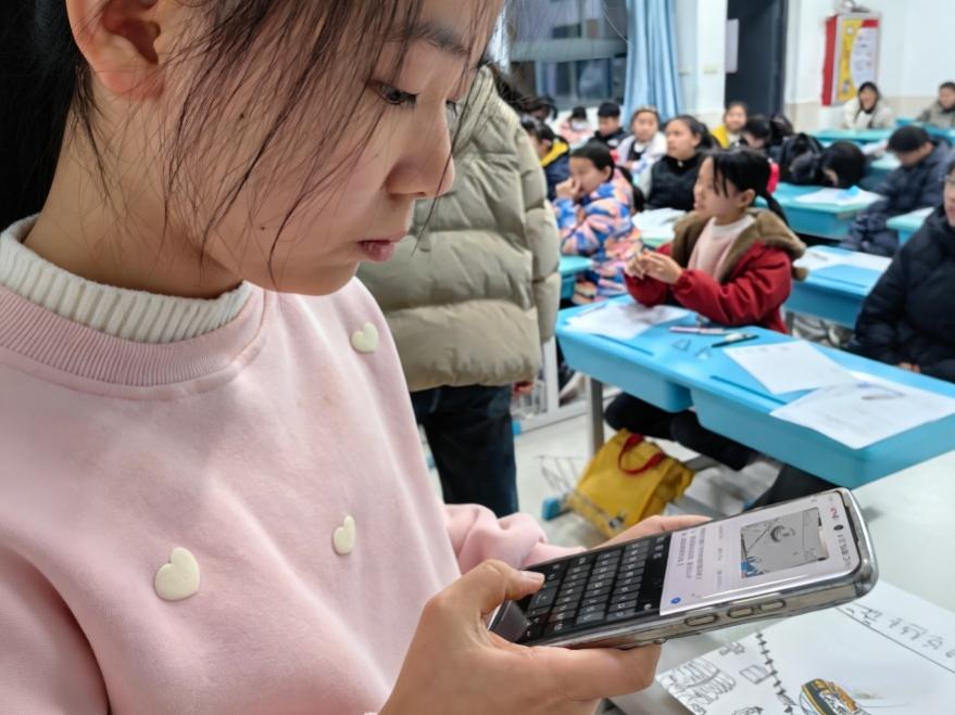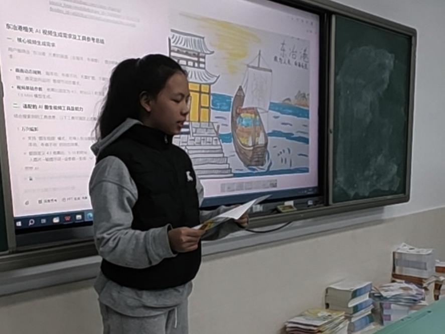 队员杨鹦霞为传统绘画注入现代科技力量,将课堂推向高潮。同学们借助AI工具,将刚完成的港口手稿转化为一段段动态视频。静止的帆船开始在屏幕上破浪前行,海浪轻抚港岸,古港景象顿时栩栩如生。大家惊喜地看着自己的画作“活”了起来,并尝试为动态画面配写港口自述旁白,亲身经历从静态绘制到动态叙事的完整创作过程。