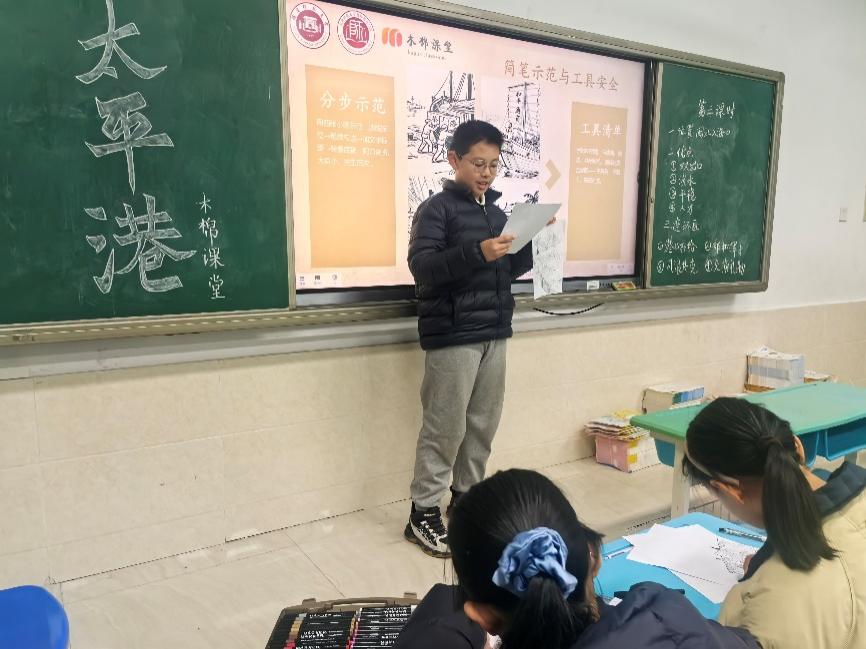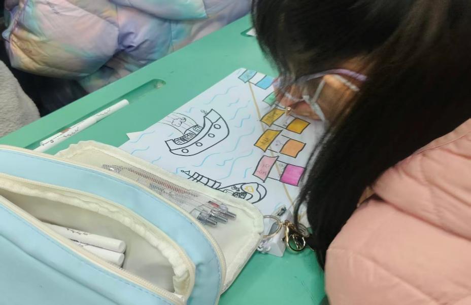 1月31日下午,课程进入创意实践阶段。队员陈力妍首先带领同学们系统回顾四大古港的知识脉络。随后,同学们选择自己最感兴趣的港口,在纸上精心绘制心中的港口图景,并写下生动的港口自述:“我是太平港,见证郑和宝船启航……”“我是马尾港,守护着海丝的疆土……”。笔尖流淌的是孩子们对海丝历史的初步理解与独特想象,一幅幅充满童趣的画作与一段段真挚的文字,为后续的科技融合创作奠定了坚实基础。