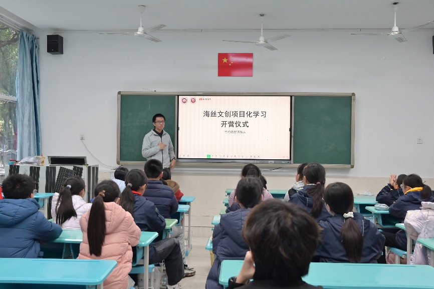 开营仪式上,队员张凯昡向同学们生动阐释了课程核心任务——探寻福州四大古港,掌握文创设计,争做海丝文化的小小传承者。首堂课上,张凯昡带来了“东冶港——福州海丝起点初探”课程,通过古地图与文物图片,带领同学们认识福建最早有文字记载的海港。紧接着,队员杨鹦霞引领同学们走进五代时期开设的“甘棠港”,通过模拟贸易活动,同学们分组扮演福州商人与外国商人,在沉浸式体验中理解“开放包容、务实惠民”的通商精神。
